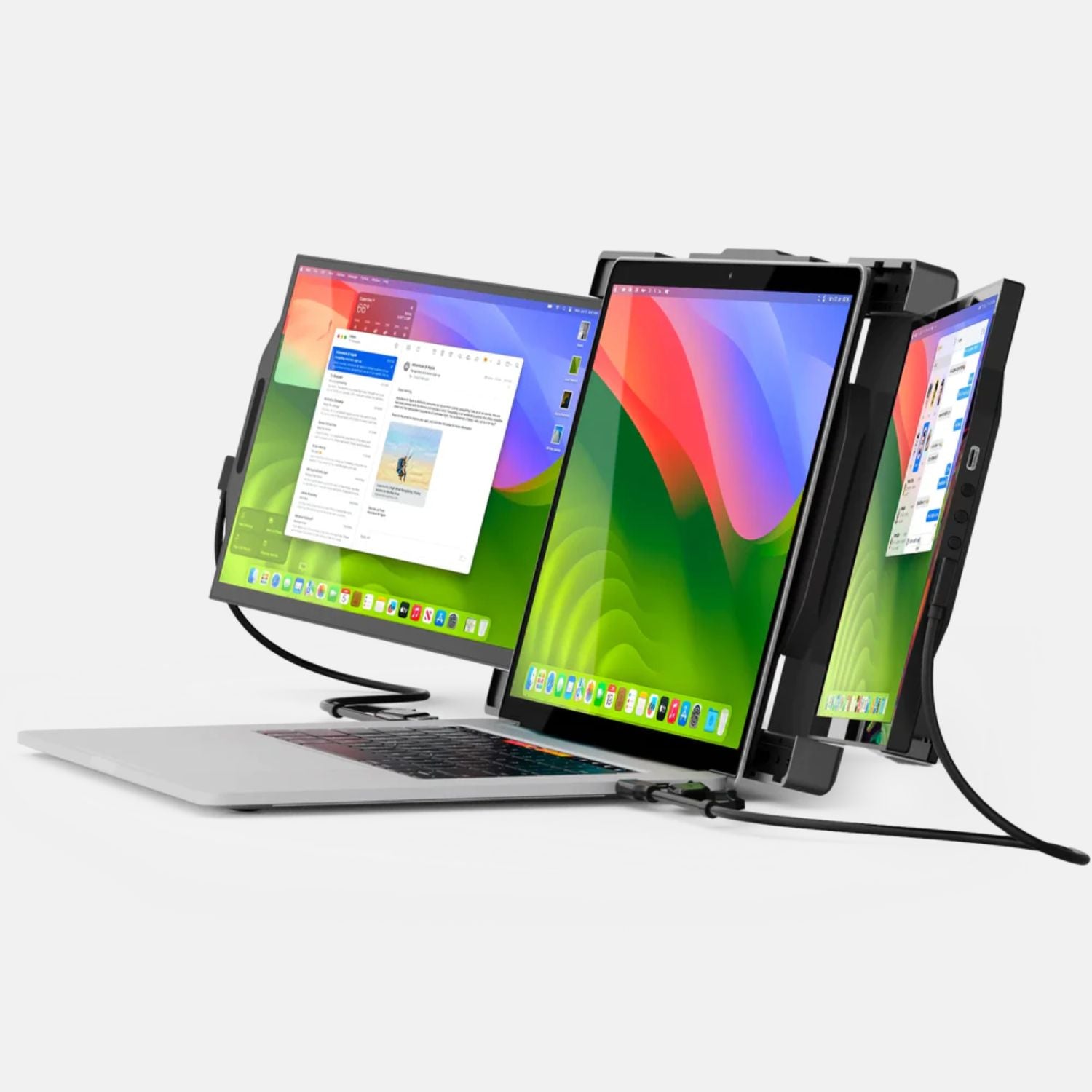 El Trio Max ahora se extiende mediante un mecanismo deslizante de segunda etapa. Esto permite que las pantallas se deslicen dentro y fuera de su carcasa aún más, pivoten alrededor de la pantalla de tu notebook y se oculten por completo cuando están completamente colapsadas para una apariencia más limpia. Descubrirás lo versátiles que son las pantallas deslizantes para satisfacer múltiples propósitos.
